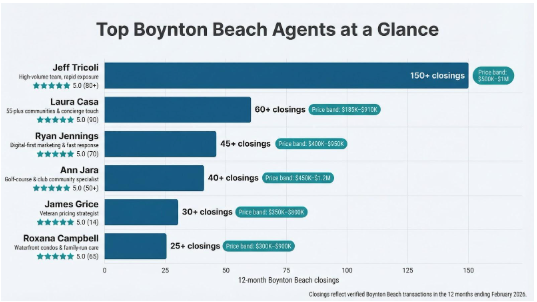 *Closings reflect verified Boynton Beach transactions pulled from MLS and public review platforms during the 12 months ending February 2026.