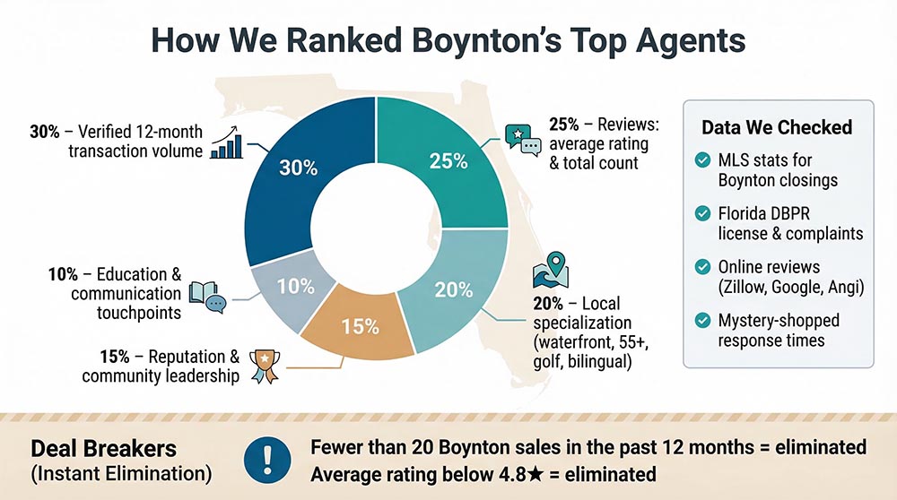 We pulled every licensed agent who closed a Boynton sale in the past 12 months (more than 700 names). To spotlight the standouts, we built a scoring model grounded in fresh MLS stats and public feedback.