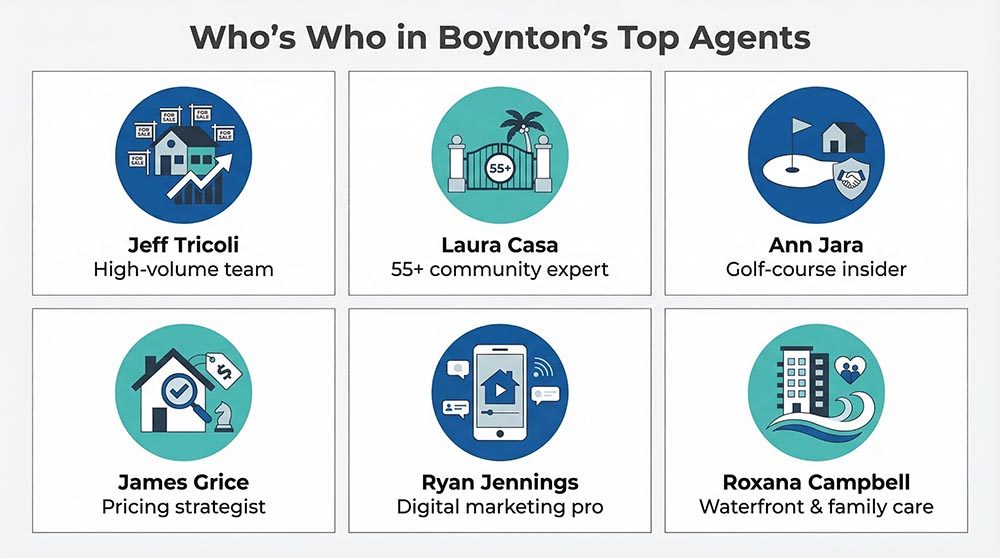 Boynton Beach’s 86-day average masks a wide gap between agents who move fast and those who let listings drift. Jeff Tricoli’s volume machine, Laura Casa’s 55-plus expertise, and Ann Jara’s golf-course fluency each shave weeks off that timeline for different reasons.